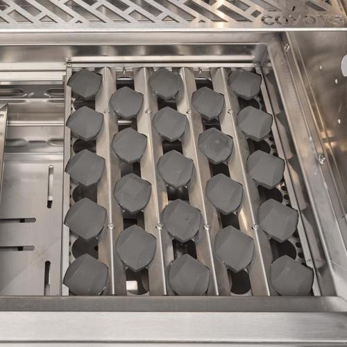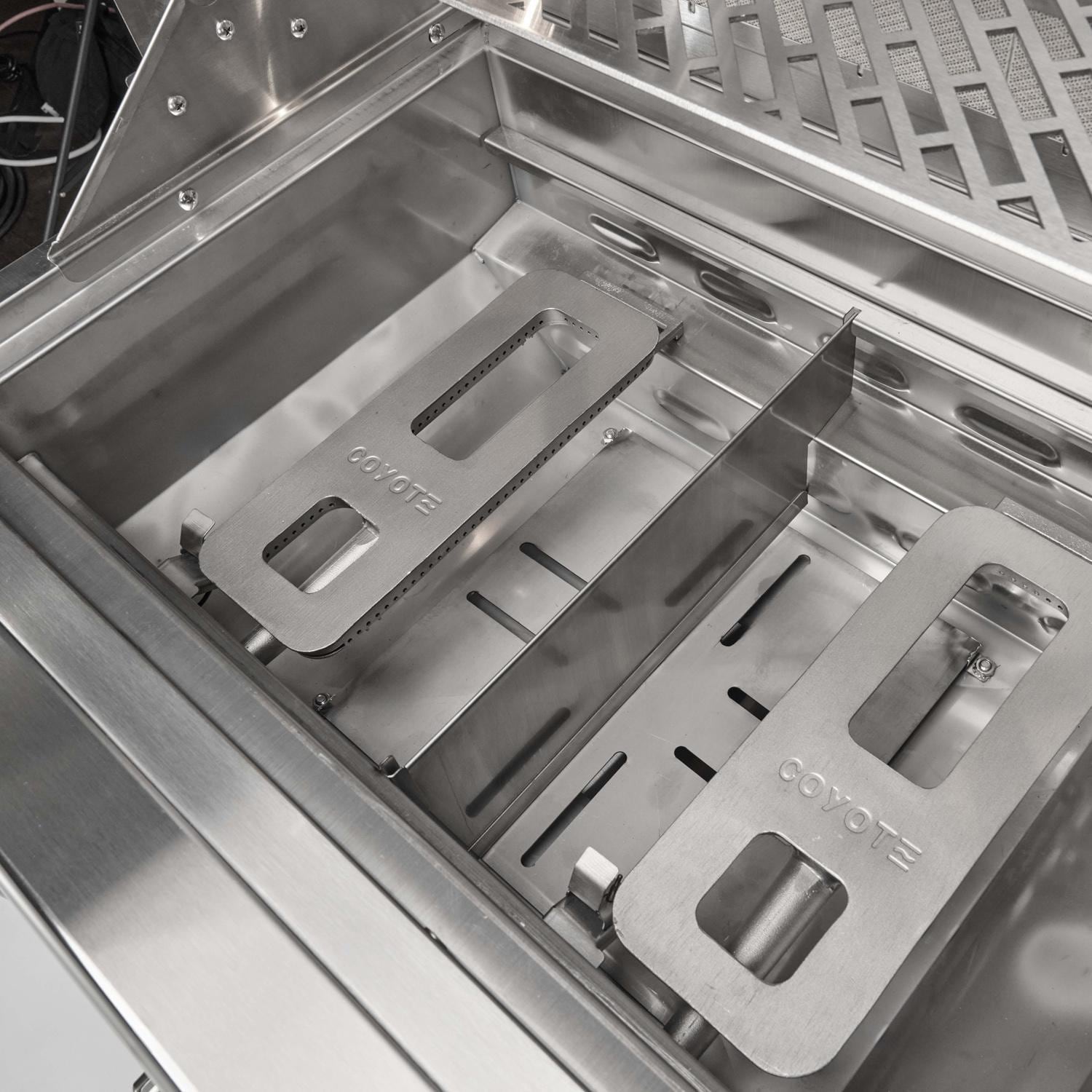 The Coyote SL-Series 36 inch built-in propane grill offers innovative safety features & top of the line performance. Built from premium 304 stainless steel, this grill is packed with premium features including a spring-assisted hood, interactive lighting, & warming rack. The Coyote logo throw light not only makes a statement but illuminates your grilling area for the ultimate nighttime grilling experience. The double walled hood provides excellent insulation, helping to retain heat more effectively. The integrated wind guard ensures consistent heat and performance, so you can keep grilling even in windy conditions. The newly updated design also includes sleek knob and bezel styling, an improved end cap, and a sturdy handle for a refined look. Unique volcanic stone briquettes work in tandem with the four powerful Infinity burners to provide excellent heat retention & consistent heat across the laser-cut grates. The interchangeable sear burner, rear burner, & rotisserie kit offer additional versatility, giving you the flexibility to create a variety of dishes. Designed for optimal safety & reliability, the innovative safety valve & thermocouple system allows gas to flow only when a flame is present. If the flame goes out, the thermocouple automatically shuts off the gas, preventing any potential hazards. Grill with peace of mind and enjoy outdoor cooking in your backyard for years to come.