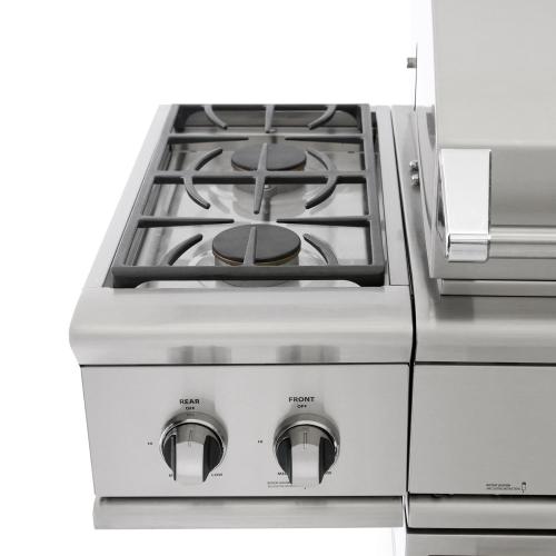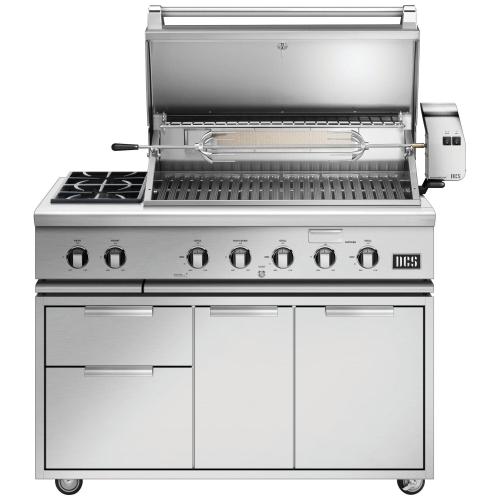 DCS grills are engineered for people who want to cook just like a professional chef in their own home. This 48-inch propane gas freestanding grill features three 25,000 BTU U-shaped stainless steel burners that push an impressive total of 75,000 BTUs of cooking power. Each burner features a heat shield that directs heat upwards, maximizing grilling efficiency. DCS grills offer Ceramic Radiant Technology, which is a layer of ceramic rods placed between the burners and cooking grate. The rods provide intense, yet even heat, ensuring the temperature is consistent across the entire grilling surface. This innovative feature allows you to sear meat to perfection anywhere on the cooking grid. This grill boasts a 630 square inch main cooking surface with durable, double-sided cast stainless steel cooking grids. One side has a gentle curve for delicate items such as fish and vegetables, while the other side accommodates steaks and other cuts of meat, capturing grease while creating perfect sear lines. DCS BH1 grills feature a wider range of cooking temperatures with valves that can be turned down to as low as 300 degrees at the grilling surface. The patented Grease Management system effectively channels grease and oil away from the flame while grilling, which greatly reduces flare-ups. The 14,000 BTU infrared rear burner functions perfectly for slow-roasting, and the included rotisserie kit can accommodate up to 50 lbs! The smoker tray is welded closed so you can add your favorite wine or beer into the tray. A dedicated 3,500 BTU smoker burner allows the wood chips to slowly smolder for more layers of flavor. The removable warming rack features a spacious 241 square inch, stainless steel warming area. The temperature gauge allows you to control cooking temperatures. Cook something on the side with the integrated side burner unit which features two burners with 34,000 total BTUs of cooking power. The push and turn 9-volt battery ignition operates with the ease of an indoor range, and the 40-watt halogen Smart Beam BBQ grill light adds visibility while you grill. Every DCS grills is handcrafted and constructed entirely of heavy gauge, type 304 stainless steel. The DCS CAD grill cart is constructed of 18 gauge, 304 grade stainless steel and features a pull-out propane tank storage bin, drawer for trash can storage, one small drawer for holding grilling tools, and one large drawer for holding larger items such as wood chips or grill cover. The larger drawer can also be filled with ice to keep drinks or food chilled.