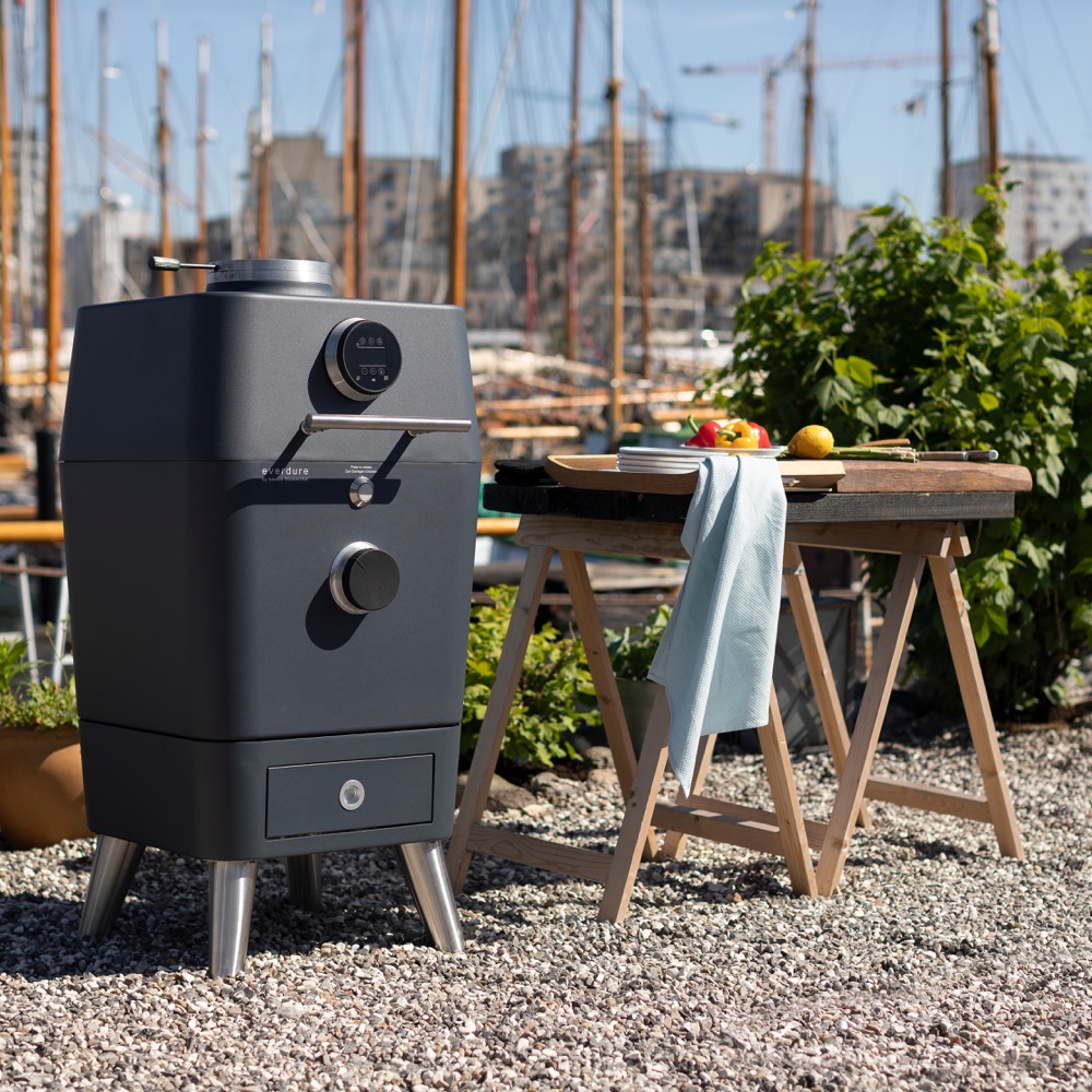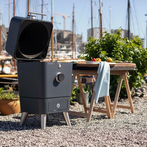 Electric Ignition Charcoal Outdoor Grill. Merging the rich history of charcoal grilling with precise technology and a modern design aesthetic, the 4K brings the authentic flavor of charcoal that humankind has enjoyed for millennia, to your home more efficiently then ever before. The 4K is a premier outdoor oven winning numerous awards and allowing flawless grilling results with touch glass controlled Fast Flame Ignition, oven and food temperature display, and internal lights for night cooking. There are so many intuitive perks in the 4K, that you will be finding new ways to cook for a very long time. Unique airflow control guarantees simple temperature control utilizing both the bottom and top vents that are marked with numbers for a more responsive and balanced flow of air, allowing an impressive temperature range. The LED digital control panel allows you to easily control all the functions of the 4K while low and slow smoking, convection roasting, open direct grilling and even pizza high heat baking. With 2 discreet air temperature probes in the hood and 4 removable food probes internally, all data can be accessed via bluetooth to our free app which is also packed full of hints, tips, recipes and alerts. Cool to touch exterior with double-walled heat insulated body, shields the outside from reaching extreme temperatures whilst retaining all generated heat.