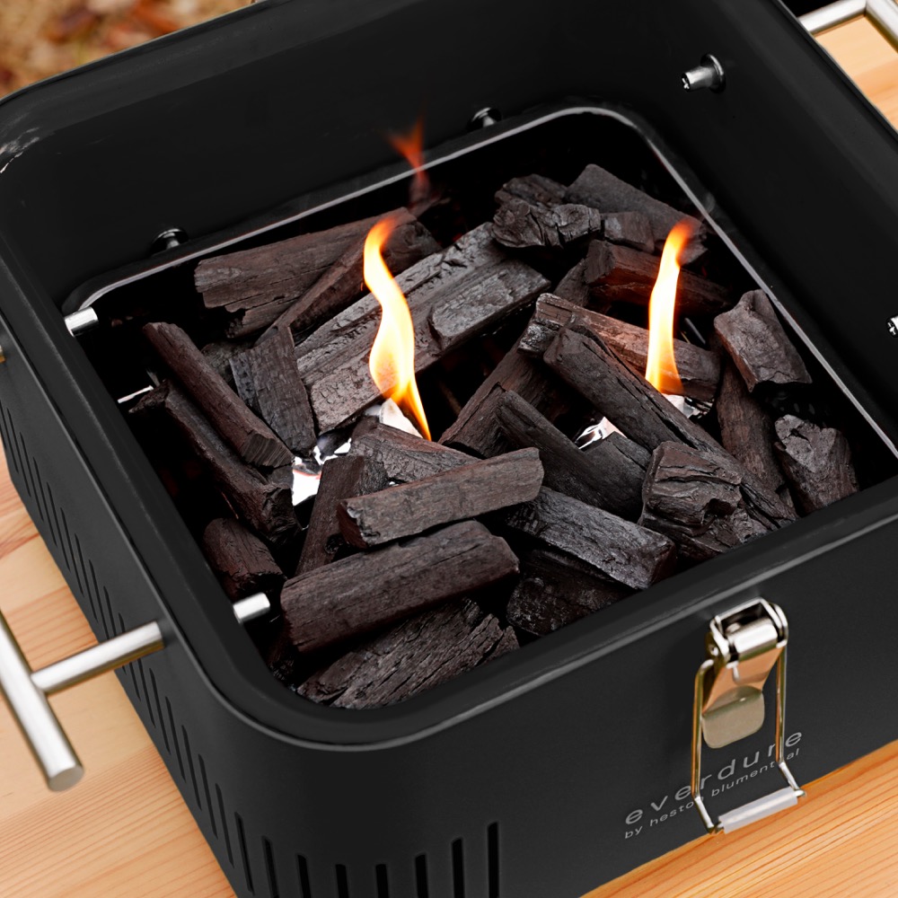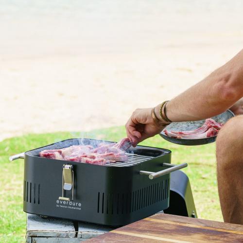 The Everdure CUBE portable charcoal grill (HBCUBEBUS) by Heston Blumenthal is great for outdoor grilling anywhere you want to be. The small and compact design of this grill allows you to grill in countless situations in an instant. Whether it be at a picnic, while camping, or an impromptu gathering of friends and family, you will always be ready. The CUBE series grills are made of powder-coated steel with chrome handles that remain cool to the touch while grilling. The built-in heat protection shield provides enhanced protection on any surface when grilling in almost any environments. The firebox is made of porcelain enamel for added durability and encases a removable charcoal tray that allows for quick and effortless clean-up when you are done. A self-healing bamboo prep tray and food-grade plastic storage tray come latched to the top of the CUBE grill and let you store food and items while on the go and get food prepped when you are ready to get started. This model has a Black color painted exterior.