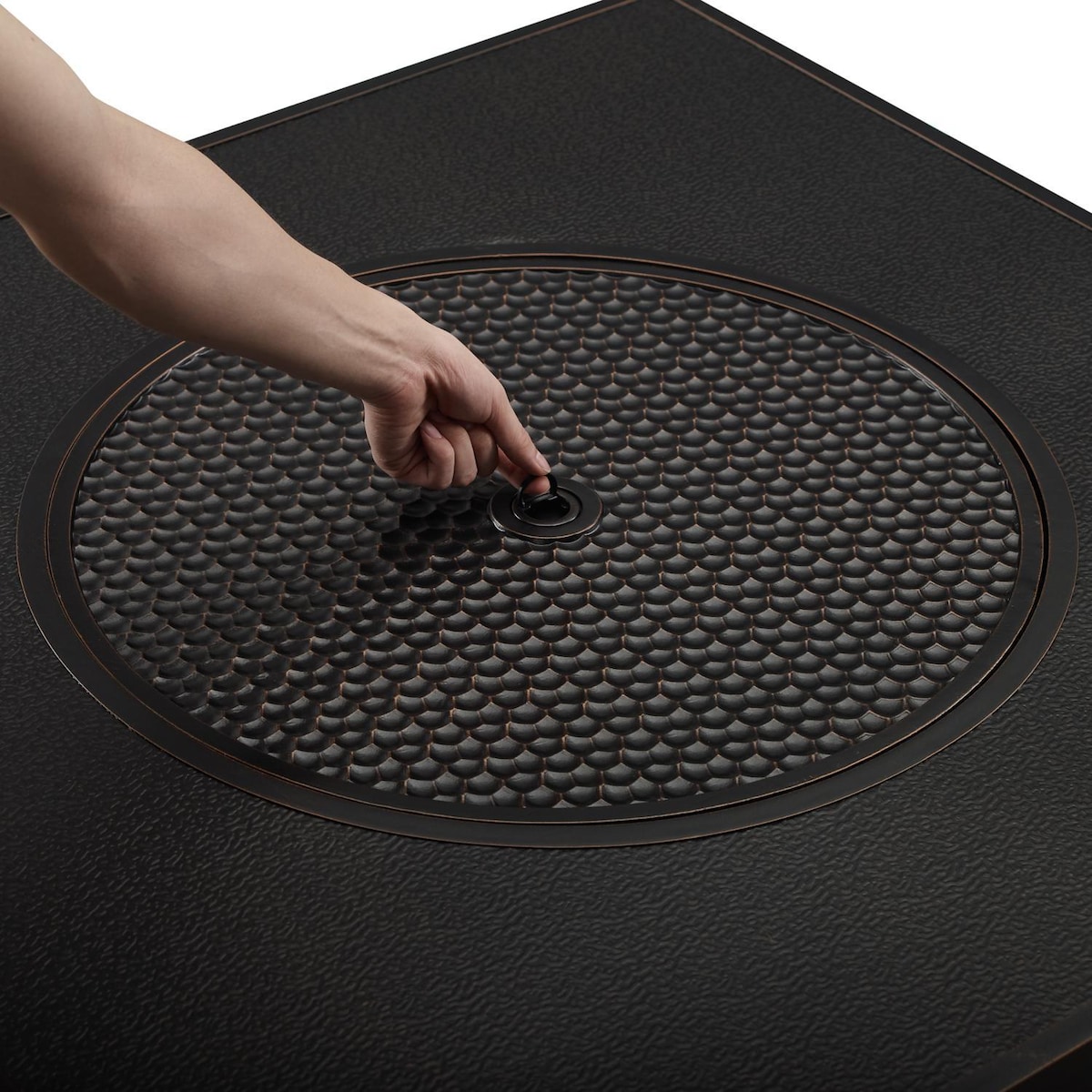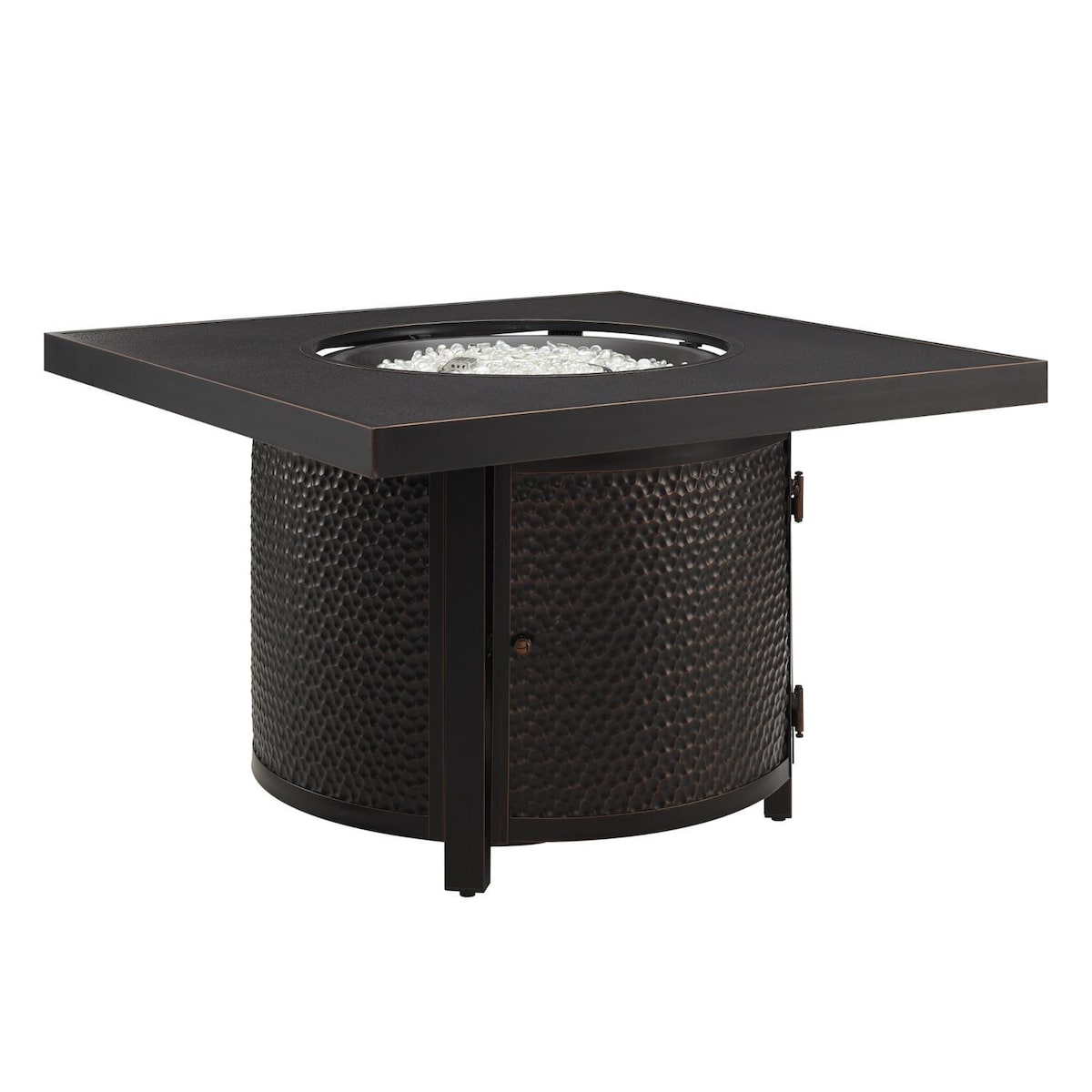 Compatible with any contemporary or traditional outdoor decor, the Clayton Square Aluminum Gas Fire Pit features a hammered motif complemented by a subtly-pebbled table surface and round base. With an Antique Bronze brushed finish, practical aluminum build, and an output of 55,000 BTUs, this versatile fire pit pulls double duty as a patio table when you add the included fire bowl lid with flush-mounted handle. Arriving with clear fire glass for a stylish touch, just add a standard 20 lb propane tank behind the convenient hinged door. A nylon cover for the fire pit is included for your convenience.