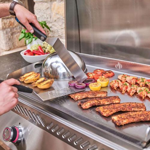 Transform your outdoor cooking with our Built-In Griddle. Made from premium 304 stainless steel, this griddle features a robust 430 stainless steel cooking surface and a convenient removable lid. Enjoy effortless starts with the one-touch integrated ignition system. For added safety, the Safety Glow knobs with a Flame Sensor glow red when the gas is on and switch to blinking red if the flame goes out. Installation is straightforward with a standard 32-Inch footprint. With two high-performance U-shaped stainless steel burners, this griddle ensures even heat distribution and top-tier cooking results. The dual-zone control system provides precision temperature management, allowing you to prepare multiple dishes simultaneously. Grill up to 28 burgers at once on the generous cooking surface. Cleanup is simple with front-access grease management, featuring an easy-to-remove grease tray and an integrated scraping tool.