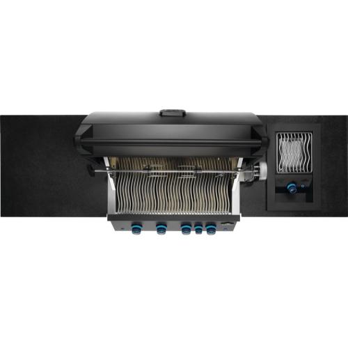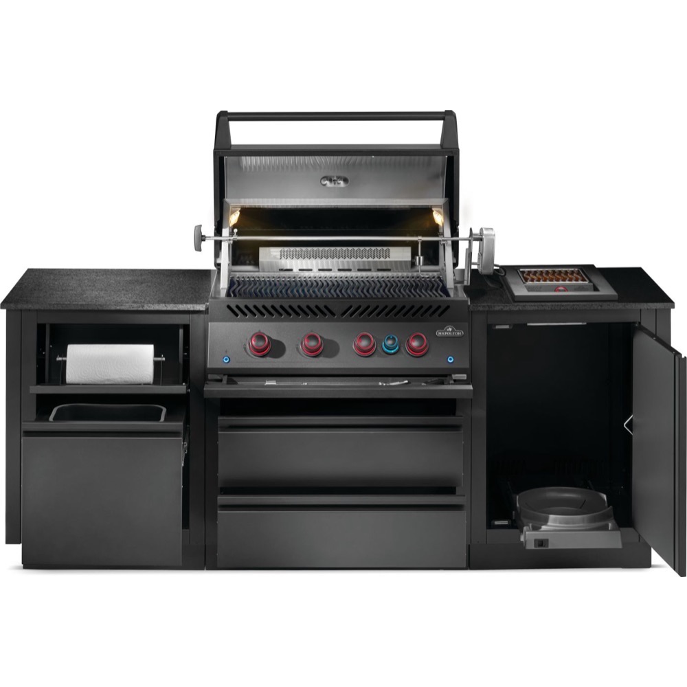 Bask in the luxury of an outdoor kitchen with the wing-shaped OASIS 300 Modular Island Kit. Providing the perfect amount of storage and workspace along with the full-sized, 700 Series 32-inch gas grill head. This unit comes with a propane tank storage cabinet that features a rollout for easy propane changes. Each cabinet is built for durability, featuring Matte Black, powder coated, galvanneal. Fully customize this workspace by selecting your own countertop in the material and finish that matches your style. The hard work is already done and all necessary specs are provided. OASIS Modular Island Kits are easy to install. There are knockouts for electrical, gas, and water, as well as easy-to-level feet. Create the perfect outdoor kitchen experience with loads of convenient storage and a durable finish that will handle anything the elements can throw at it.