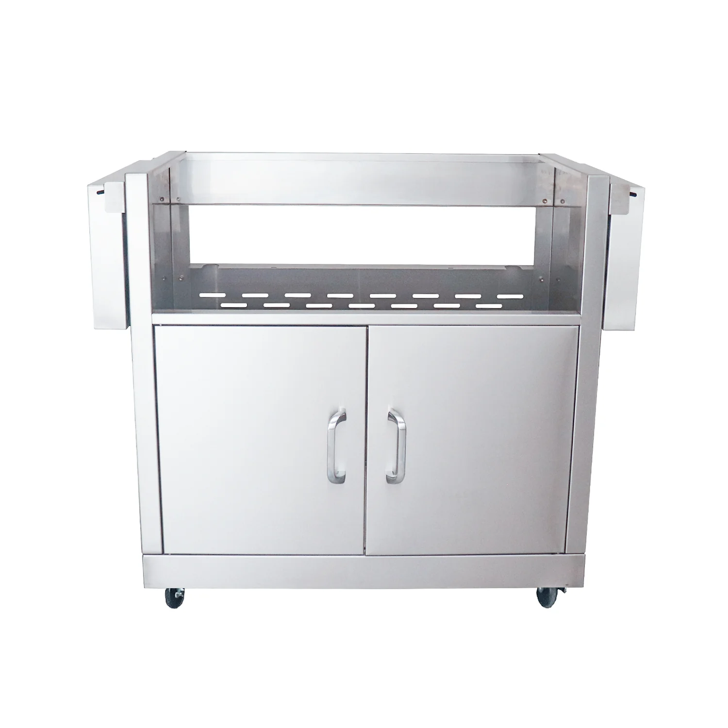 This RCS Stainless Steel Cart is to be used with the RCS 30 Inch Gas Grill. Includes fold-down side shelves, two doors, slide-out tank tray, all stainless steel housing and swivel casters.