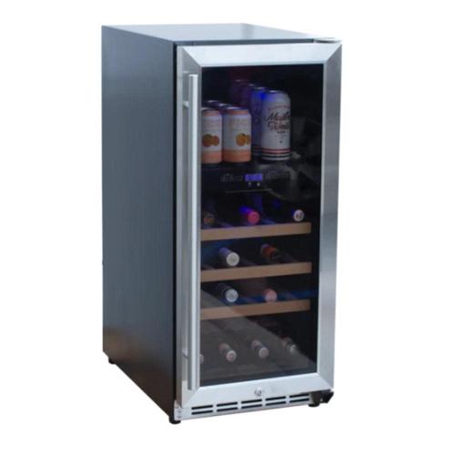 The Wine Cooler features a glass front door, 4 wooden shelves, Dual temperature zones with separate controllers, dual internal lights and a locking door.