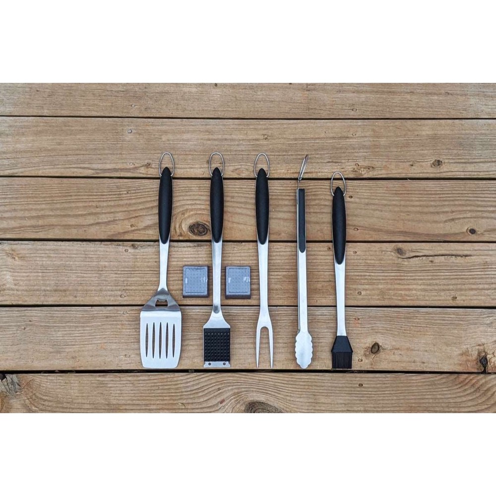 This 7-piece set of professional quality grill tools is just what you need. Have you ever burned your hand getting too close to that perfectly seared ribeye? Has your grill brush met the end of its life... yet the handle was still perfectly weathered in? Did you stick your in-law's burger to the grill and need to scrape it off real quick before she notices? Did you ever go out to the grill with an unopened beer (your mistake, but? we understand!)? Or did you ever need a fork that... well, wasn't long enough? We have you covered on all fronts with this one, compact, professional grill tool package.