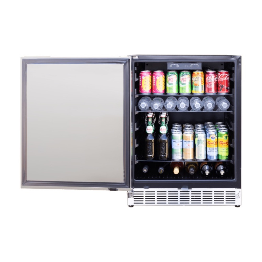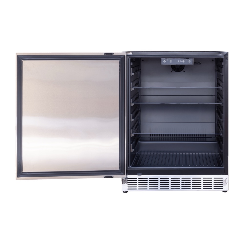 Premium refrigeration from Summerset Grills features a 24-inch Outdoor Refrigerator. With 5 cubic feet of storage with 161 Can Capacity, a temperature range of 32F to 72F degrees, and a Gold Standard Warranty, this appliance will help keep your food fresh, wine chilled, and beer cold, bringing the function of your indoor refrigerator outside in a compact sleek style.
