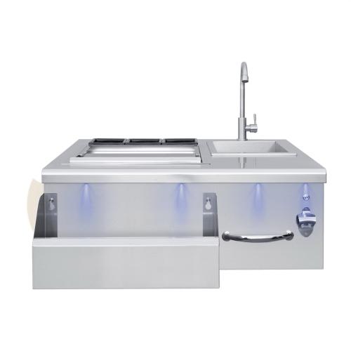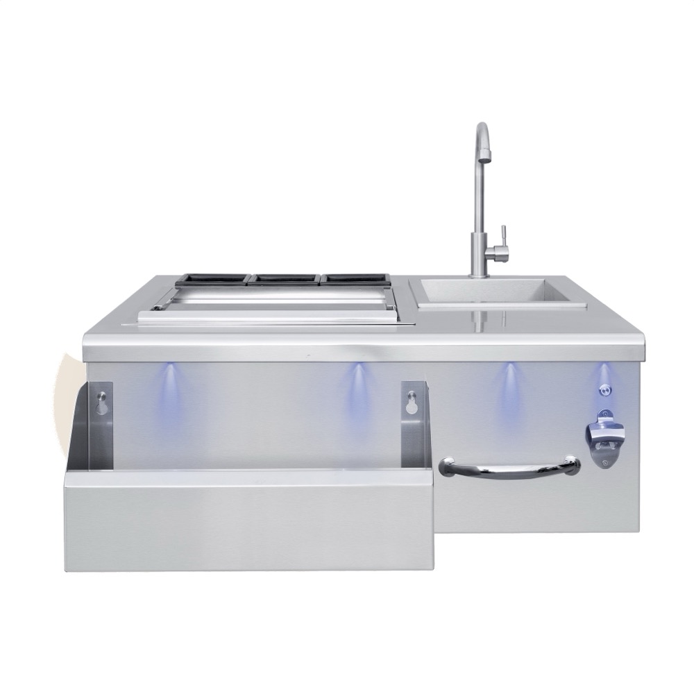Come prepared with all the ingredients for the perfect outdoor patio bar night. The Summerset Grills (BC-30L) 30-inch bar center with ice chest and sink integrates with your Summerset Grills outdoor BBQ island to add the finishing touch to your outdoor kitchen grilling spot. The Summerset Grills BC-30L double side burner is made of 304-grade stainless steel and will provide you years of outdoor bartending enjoyment. The stainless steel removable lid protects the ice chest when it is not in use and features a curved handle to match other Summerset Grills Products. The BC-30L bar center features an ice chest with a sliding lid to keep ice cool, sink with faucet, condiment tray for cherries and other garnishes and a bottle rail with a towel holder to keep your hands dry as well as a bottle opener and towel holder. Front control panel matches exactly to the Summerset Grills Sizzler Pro, TRL and TRLD Series grills and bright blue LED lights to illuminate the knobs for beautiful nighttime aesthetics.