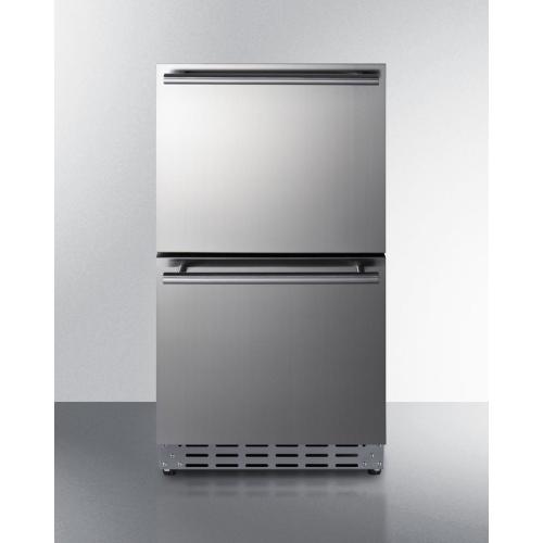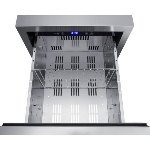 Summit manufactures one of the industry's most extensive and unique selections of outdoor refrigeration, with weatherproof choices designed to bring user convenience and lasting durability to outdoor kitchens. Sized at just 18" wide and 32" high, model ADRD18OS a two-drawer outdoor all-refrigerator that can be built-in under ADA compliant counters or used freestanding. Complete stainless steel construction inside and out is designed to hold up to the elements in style. Soft close glides allow you to gently close each drawer with a light touch. The drawers can also be customized with overlay panels to match or accent existing cabinetry design, while the stainless steel kickplate and stylish handles complete the look. This unit includes a right angle cord for a better fit. The sealed rear offers additional protection from outdoor elements. Frost-free operation ensures minimum user maintenance inside the 3.4 cu ft. interior. Each drawer includes a divider to make it easier to separate and organize your storage, with attractive and efficient LED lighting to illuminate the interior. Intuitive digital controls display a temperature readout switchable from Fahrenheit to Celsius to best suit your preference. High/low temperature alarms audibly warn if the interior goes out of the recommended range. Additional features include an open drawer alarm, child lock to secure the controls, sabbath mode for optional observance, and eco-mode for energy savings. Model ADRD18OS is ETL-S listed to NSF-7 commercial standards and also meets DOE guidelines for residential use. Additional outdoor drawer refrigerators and freezers are available, including 15" and 24" wide choices. Browse the complete Summit lineup for more options.