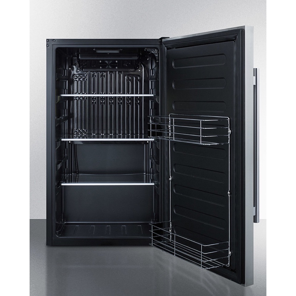 Outdoor shallow depth all-refrigerator in a 19" W x 17.25" D footprint, with stainless steel exterior and lockSummit brings energy efficiency to the outdoors with the SPR196OS, an ENERGY STAR certified all-refrigerator approved for outdoor use. The SPR196OSCSS features a versatile design that meets NSF-7 and UL-471 commercial standards but is also approved for residential use. Sized at just 19 inches wide and 17.25 inches deep, it features a stainless steel cabinet with a sealed back for safe installation outdoors and protection from the elements. The user-reversible stainless steel door adds durability and elegance to any outdoor setting and the stainless steel pro-style handle completes the look. A factory-installed lock keeps contents secure, while a right-angle plug and integrated hinge provide added flexibility in placing the unit. Two leveling legs keep the unit level on uneven surfaces. Inside, the SPR196OSCSS utilizes an internal fan to ensure the unit is evenly cooled from top to bottom. An automatic defrost system ensures minimal user maintenance, while LED lighting allows full visibility of stored items in the jet black interior. Three adjustable slide-out glass shelves with six placement positions provide flexible storage capacity inside the 3.1 cu. ft. interior. A shelving brake system offers added safety when moving and storing contents, while two chrome door racks are ideal for storing condiments, canned beverages, and other larger items. The dial thermostat, with seven temperature settings, is located in the front upper-right corner for easy temperature management. The SPR196OSCSS is ENERGY STAR certified and designed for built-in or freestanding outdoor use. For a similar unit with a glass door, see the SPR489OSCSS.
