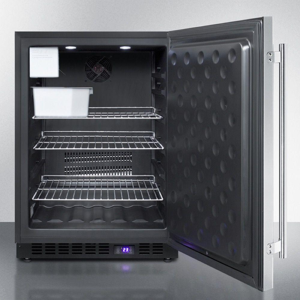 SUMMIT SPFF51OS Series features versatile frost-free all-freezers perfectly sized and featured for convenient use in outdoor spaces. The SPFF51OSCSS is a 24" wide all-freezer designed for built-in or freestanding use. The cabinet and door are constructed from stainless steel for a professional look designed to hold up to the outdoor elements. The reversible door includes a factory installed lock for added security and a sleek handle to complete the look. Inside, the SPFF51OSCSS is designed for true convenience and low maintenance operation. The frost-free design ensures users won't have to manually defrost the 4.72 cu.ft. interior, while adjustable shelves offer flexible storage solutions. Recessed LED lighting provides an attractive, energy efficient display. A digital thermostat (located in the unit's kickplate) makes temperature management easy and intuitive. With solid construction and a striking design, the SPFF51OSCSS makes an ideal finish for any outdoor kitchen. For a matching refrigerator, see the SPR627OSCSS.