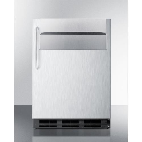 Summit offers a wide range of outdoor approved all-refrigerators for commercial use, with weatherproof designs and fully featured interiors for user convenience. The SPR7BOSSTSR has a front-breathing design for built-in installation, while the 304 grade stainless steel cabinet affords freestanding use in a durable, weatherproof design that protects from the elements. The door includes a curved towel bar handle for added style. An integrated Ground Fault Circuit Interrupter (GFCI) meets and exceeds U.L. safety requirements to protect the unit from electric shock and a sealed back keeps all components safe from the elements. For added commercial convenience, we include our 18" wide single-tier Speed Rail for easy storage and display of your bar favorites, such as mixers and liquors. Complete 304 grade stainless steel construction ensures long-lasting durability in an easy-cleaning design. The hook-style back allows for quick installation, while allowing users to remove and reposition it to best meet their needs. Two velcro strips affixed to the back assure a tight, secure fit for added safety. Inside, the SPR7BOSSTSR offers 5.5 cu.ft. of storage space in the automatic defrost interior. Our "hidden" evaporator maximizes interior space and a one-piece seamless liner makes it easy to clean. Adjustable glass shelves offer flexible storage. This unit has a dial thermostat for simple and intuitive temperature management and an interior light with an on/off rocker switch. The SPR7BOSSTSR is ETL-S listed to NSF-7 standards for use in commercial establishments such as outdoor bars, restaurants, and similar outdoor environments seeking dependable refrigeration in a stylish design. Models designed for indoor use with an included Speed Rail are available, including a freestanding model (FF7BKSSTBSR) and a built-in, ADA model (see the FF7BKBISSTBADASR).