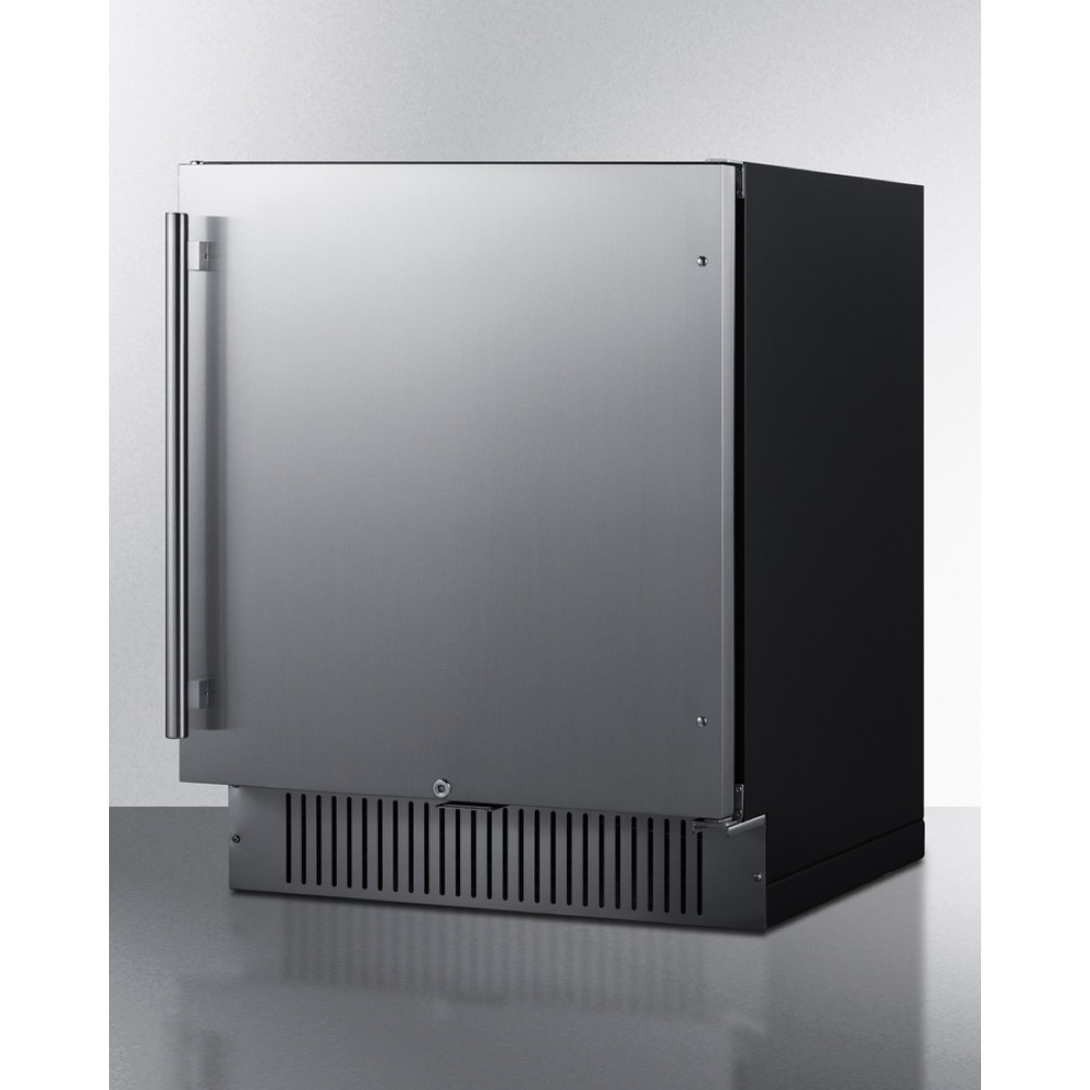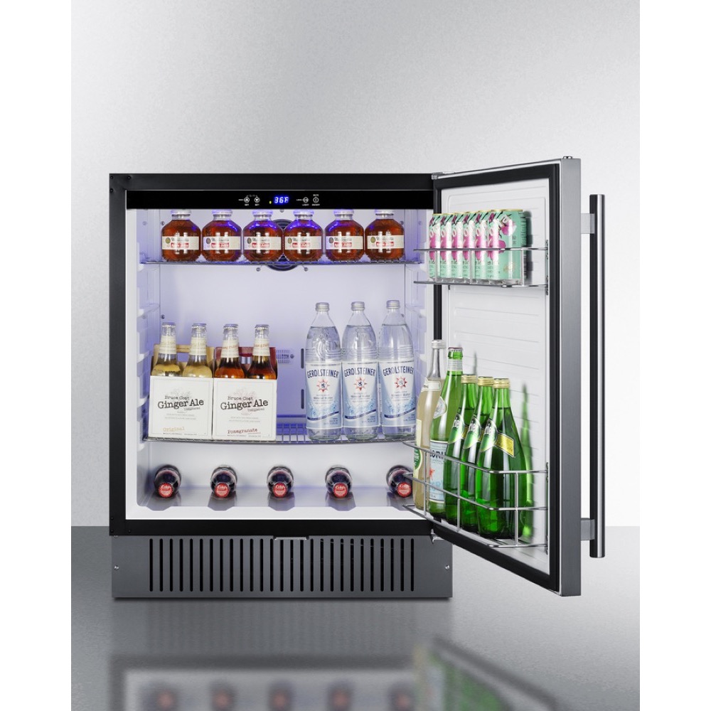Summit is expanding its popular lineup of outdoor refrigeration with new luxury choices for 27" wide spaces in residential or commercial outdoor kitchen spaces. Model SPR2700SS is an all-refrigerator sized just under 27" wide and under 24" deep for an easy fit in any space with limited depth. The versatile design allows built-in installation under counters or freestanding use, with weatherproof construction ideal for outdoor kitchens. The user-reversible door comes in a stainless steel finish with a vertical grain and a pro style handle. This unit has an integrated flat door hinge in stainless steel that does not add any additional height. The sealed back and right angle plug help to ensure an easy fit. We include a factory-installed lock on the door and two keys for optional security as needed. The refrigerator interior comes in a clean white finish, perfect for providing full visibility. The LED lighting can be adjusted between three levels of brightness to best suit your preferences. Additional features include a 96-hour Sabbath mode setting, high/low temperature alarm, and a child lock to secure the digital control panel. Adjustable chrome shelves make it easy to rearrange the interior as needed for the optimum storage. The door includes two racks ideal for holding condiments and the floor is slotted to keep bottles in place. The SPR2700SS is ETL-S listed to NSF-7 commercial standards and is also approved for residential use. The weatherproof construction allows use in indoor or outdoor kitchens. Additional 27" wide choices are available in drawer style (SPR275OS2D) and ADA height (FF27BSSADA). For this unit with a set of four commercial casters, see the FF27BSSCAS.