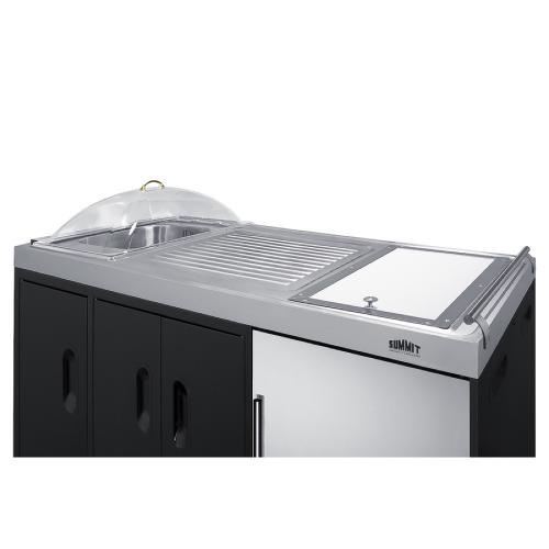 Bring new convenience to outdoor entertainment with Summit's fully featured selection of mobile outdoor kitchenettes. Model CARTOS54LG is a 58 inch wide mobile cart that comes fully featured for backyard entertaining. We include our popular outdoor beverage refrigerator (model SPR488BOSADA) for reliable, weatherproof beverage and condiment storage. The refrigerator features a glass door with a seamless stainless steel trim and front lock, allowing you to secure items when not in use. Next to the refrigerator, two jet black cabinet doors protect your full-extension slide-out waste receptacle. We include two plastic bins that fit perfectly inside. The stainless steel work surface offers plenty of room for mixing beverages or prepping your party. A recessed cutout features a removable cutlery tray that can be covered with our durable cutting board, letting you maximize useful counter space. The left side includes a sink compartment that can be connected to your garden hose to dispense cold water. We also include a removable clear dome that covers your sink, allowing you to create your own ice bucket system to keep items chilled and protected from pests. We supply a waste drain bottle that can easily be installed under the sink area and emptied as needed. For smooth portability, the CARTOS54LG is equipped with four heavy duty caster wheels (front two are locking) and a stainless steel towel bar handle for easy steering. A stainless steel speed rail is installed on the left side for convenient dry storage. This unit is constructed from stainless steel and powder-coated metal. We include a vinyl cover to help protect the unit from the elements when not in use. In addition to this unit, we also manufacture a cart with a glass door beverage center (model CARTOS54LS), as well as a full assortment of built-in outdoor refrigerators, freezers, kegerators, icemakers, and more. Browse the full Summit product line to discover the perfect solution for any outdoor kitchen space.