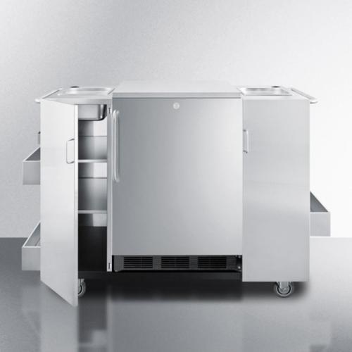 SUMMIT's CartOS brings luxury and convenience to the outdoors in a stainless steel serving cart. This 61" wide unit lets you create an upscale kitchen right in your own backyard, beginning with ample storage space. Keep items on three exterior shelves and inside magnetic locking doors fitted with elegant towel bar handles. The cart includes room for ice storage and a removable stainless steel countertop. CartOS is completely constructed from 304 grade stainless steel to weather the elements in classic style. You can remove the center to install a SUMMIT refrigerator, freezer, or beer cooler for more storage options. NOTE: Refrigerator shown in image is not included.