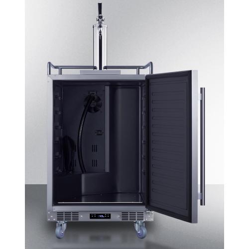 Summit manufactures a complete line of built-in kegerators designed for indoor/outdoor use in commercial settings. The BC74OSCOM is a full-size kegerator designed for dispensing beer on tap. It is ETL-S listed to NSF-7 and meets UL-471 standards for use in commercial establishments. Sized at just 24" wide, it features a weatherproof 304 grade exterior for long-lasting durability safe for use in outdoor settings. The front-breathing system allows built-in installation, while the fully finished cabinet and included caster set make for easy freestanding, portable use. This unit features a user-reversible stainless steel door with a pro style vertically mounted handle. The sealed back allows for easy cleaning of the unit. Additional features include a removable two-piece stainless steel drip tray to collect spills and a chrome guard rail to help keep glasses and mugs in place. For added security, we include Summit's TapLock, a removable lock that allows you to secure the tap faucet as needed to prevent unsupervised access to the kegerator contents. Inside, the 5.6 cu.ft. interior can accommodate a full half or slim quarter keg, or up to three Cornelius or sixth barrel kegs. We include a complete commercial grade tap kit for dispensing your favorite beer, including a Sankey tap system and single tap draft tower, along with a CO2 tank and regulator. A tap cool system keeps your beer cold as it goes through your tower, and a Velcro strap holds the CO2 tank in place. The interior floor is made from stainless steel to add protection when loading and removing kegs. Two chrome shelves, with six placement options, allow the kegerator to also function as a beverage refrigerator. A digital thermostat makes it easy to manage the wide range temperature, while the external digital display has a readout in Celsius or Fahrenheit. Automatic defrost operation ensures minimal user maintenance. The Memory IC function recovers the unit's last settings in the case of a power outage or disruption. With its solid construction, user-friendly features, and attractive design, the BC74OSCOM is the perfect beer dispenser for indoor or outdoor commercial settings. Additional choices are available with alternate tapping options, including choices to dispense wine and coffee. Browse the full Summit line to explore all of your options.