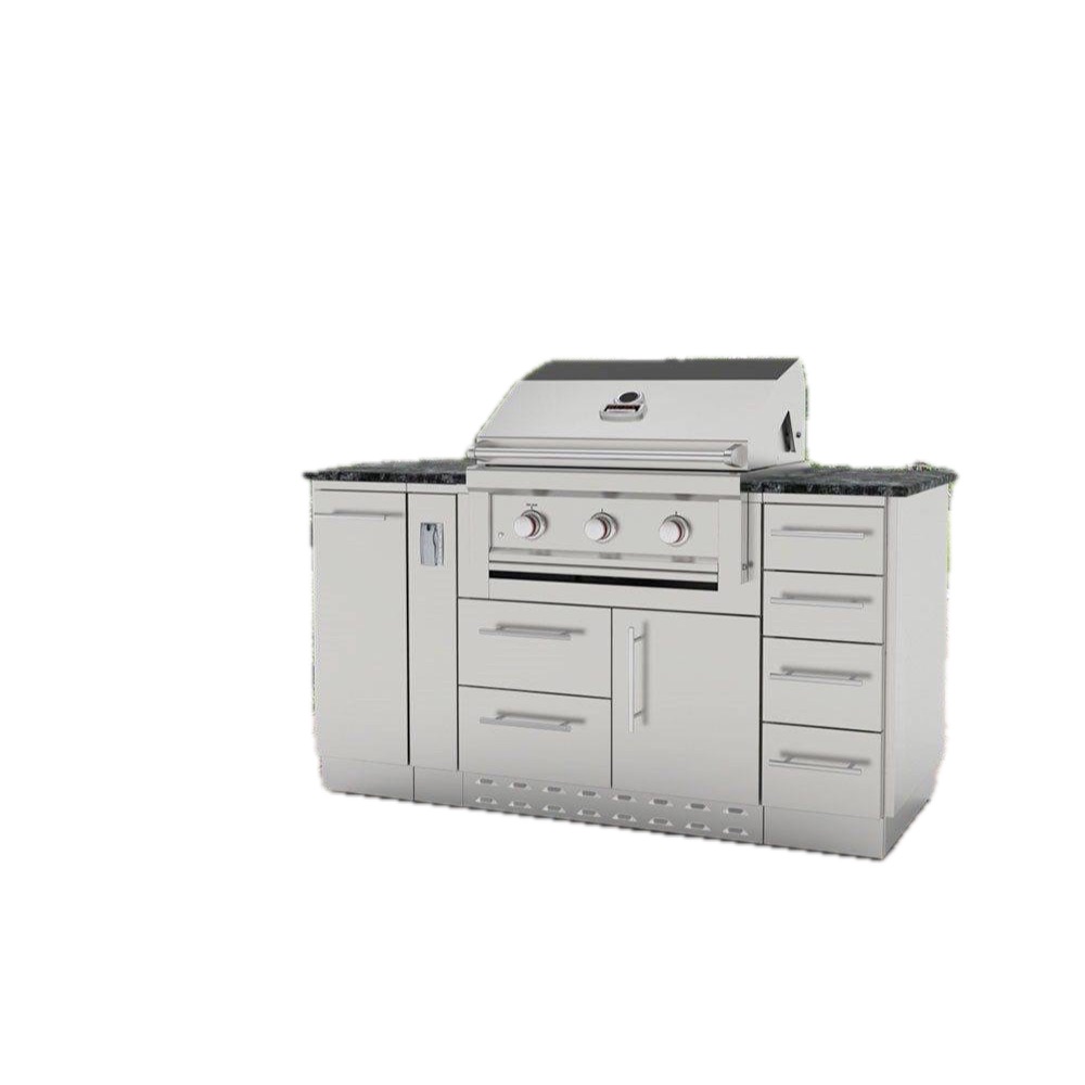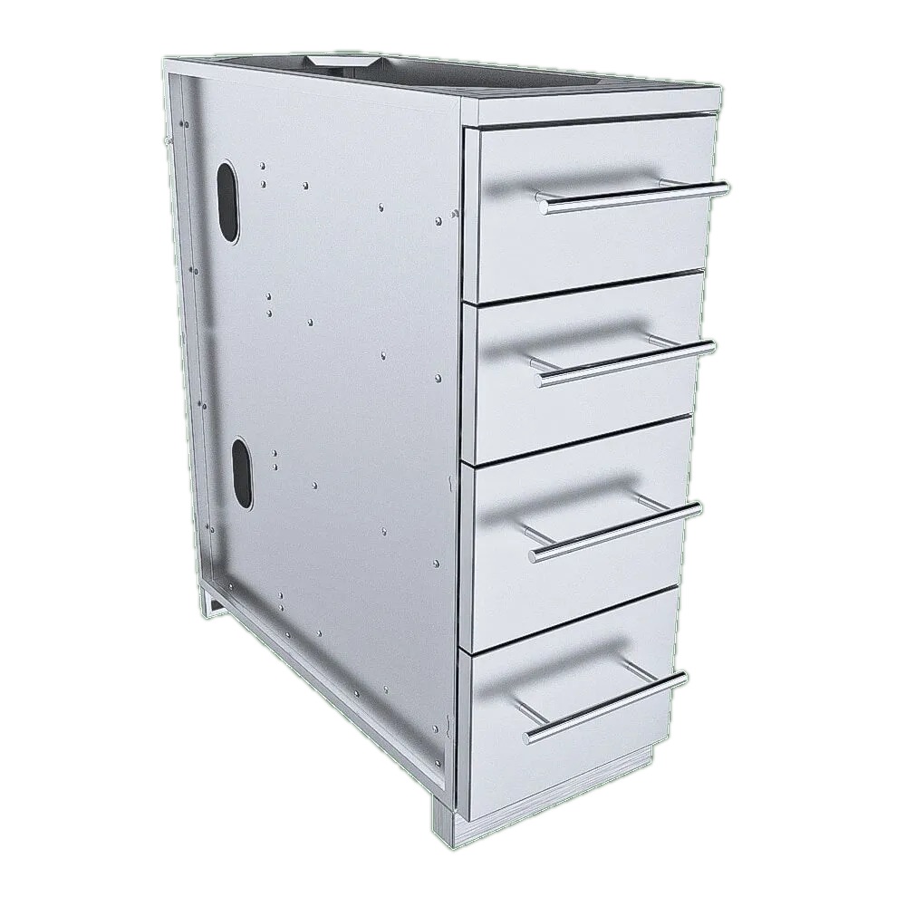 The Sunstone 12 In. Multi-Drawer all with Soft-Closing Features Cabinet, offers you the Perfect Space Filler and Perfect Solution for needed extra storage, with 4 individual drawers all similarly sized, best placed next to your BBQ Grill or Bar Serving Station. Keep all your Cutlery, BBQ Tools, BBQ Sauces, Towels packed in this perfect space and storage saver. This cabinet is often purchased as a set of two, side by side, making a larger 24 In. Cabinet; now with Eight Drawers all together, you can just imagine the many possibilities. The Cabinet is designed to Blend perfectly with most other industry Brands BBQ Grills and Components with its even toned #4 Horizontal Light Brushed Finishes, all 304 Stainless Steel Construction, and Large 304 Stainless Steel Rod Handles. Install this Cabinet in a Group or on its own, with stacked stone on either side, it makes no difference. The cabinet is finished on the back panel so it works great either against a wall, in the open, or even as a moving cart with optional wheel casters. All Sunstone Cabinets are easily installed with Pin-Locks, simply Lift and Drop each cabinet into each other, no tools are required for much of the installation process and most cabinet configurations can be setup in less than an hour. For Full-Bull nose Counters - Simply remove each of the cabinets Counter-Rail seen as the top Horizontal Column, and overlap counter over front edge making for some elegant added features. The Cabinet comes completely setup, only fasten on each Door or Drawer Handle, Hand-Screw each Adjustable Leg in place, and Snap on the Front & Back Kick-Plates.