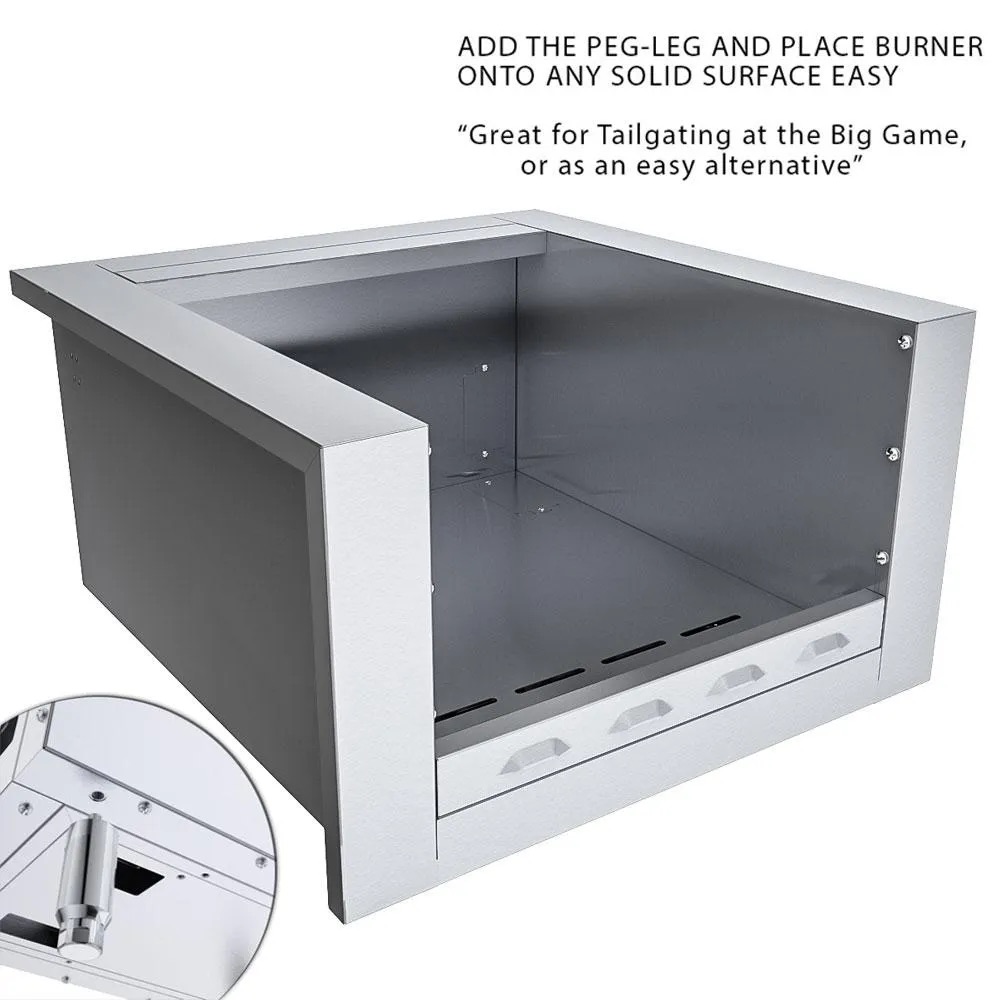 The 25 In. Sunstone Universal Appliance Jacket for most Power Burners having a maximum cut-out of 19 In. Width by 12 In. Height by 22 In. Depth. Refer to the product Specification Sheet for specific appliance detail. The universal jacket is uniquely designed to receive multiple Burner Brand Models right out of the box with minor assembly. The jacket is a safety essential when installing your burner into any outdoor kitchen or BBQ island enclosure ensuring you have an adequate heat barrier and proper venting. This jacket has double-walled construction in all 304 stainless steel with a sturdy self-supporting raised ledge around the sides and back that adds one more layer of quality to your outdoor kitchen. The Sunstone Jacket is made for perfect airflow with in/out vents in the lower front bottom edge and upper back edge which features open vents allowing pass-through venting of all excess heat and dangerous gasses. It has a universal design with covered utility ports on either side depending on which side your appliance gas or electrical is connected, you only need to open the specific ports you are using, and others stay covered for safety. The appliance is placed on top of the upper rim, so the burner is free hanging within the interior of the jacket enclosure. In addition, you can fasten in the bottom of each corner a cabinet peg-leg allowing you to place the jacket with burner onto any surface like a picnic table or blocks for when you are ready for your new burner or grill but not ready for the whole kitchen island.
