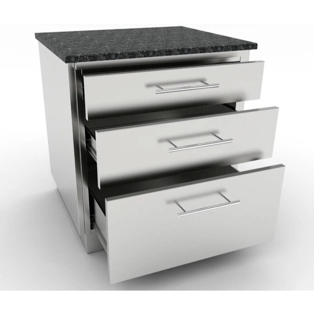 The Sunstone 30 in. extra wide soft-closing triple drawer cabinet, with the top being the smallest at 6 In. height then progressively larger going down to 8 In. and 14 In. height for the bottom drawer. This is the only cabinet you will need to handle all your storage requirements, just imagine storing all your cutlery, knives, and BBQ tools in the top drawer, towels, and BBQ sauces or spices in the middle drawer. Lastly, all your large pans and BBQ grill accessories are in the bottom drawer - easily concealing all your important items safely away and out of sight. The cabinet is designed to blend perfectly with most other industry brands, BBQ grills and components with its even-toned number 4 horizontal light brushed finishes, all 304 stainless steel construction with large 304 stainless steel rod handles. Install this cabinet in a group or on its own, with stacked stone on either side, it makes no difference, the cabinet is finished on the back panel, so it works great either against a wall or in the open and or even as a moving cart with optional wheel casters. All Sunstone cabinets are easily installed with simple pin-locks, simply lift and drop each cabinet into each other, no tools are required for much of the installation process and most cabinet configurations can be set up in less than an hour. For full-bull nose counters - simply remove each of the cabinet counter-rail seen as the top horizontal column and overlap the counter over the front edge making for some elegant added features. The cabinet comes completely set up, only fastens the door handle, hand-screw each adjustable leg in place, and snap on the front and back kick-plates.